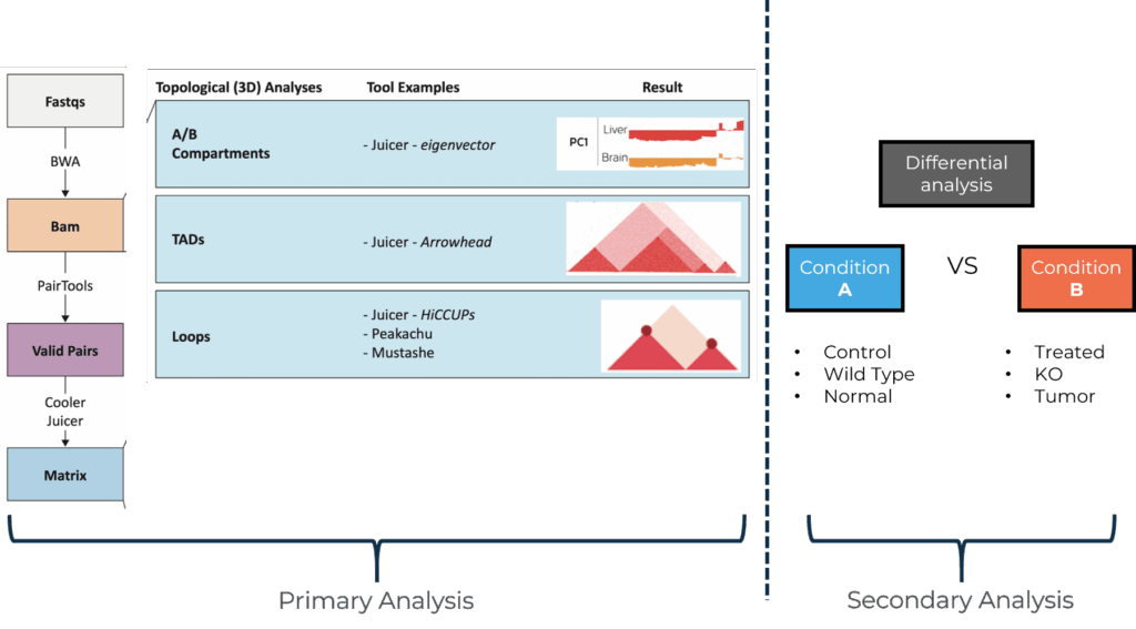 Primary Analysis – Whole Genome Epigenetics: A/B Compartment, TAD(Topologically Associating Domains), Chromatin Loop 분석 – Pan Promoter Capture Epigenetics: Promoter 중심의 Loop 분석 – HiChIP Epigenetics: 단백질-DNA 상호작용 기반 Loop 분석 – Somatic Variant Calling: SNP, InDel, CNV, SV 등 체세포 변이 검출 (Human Only)